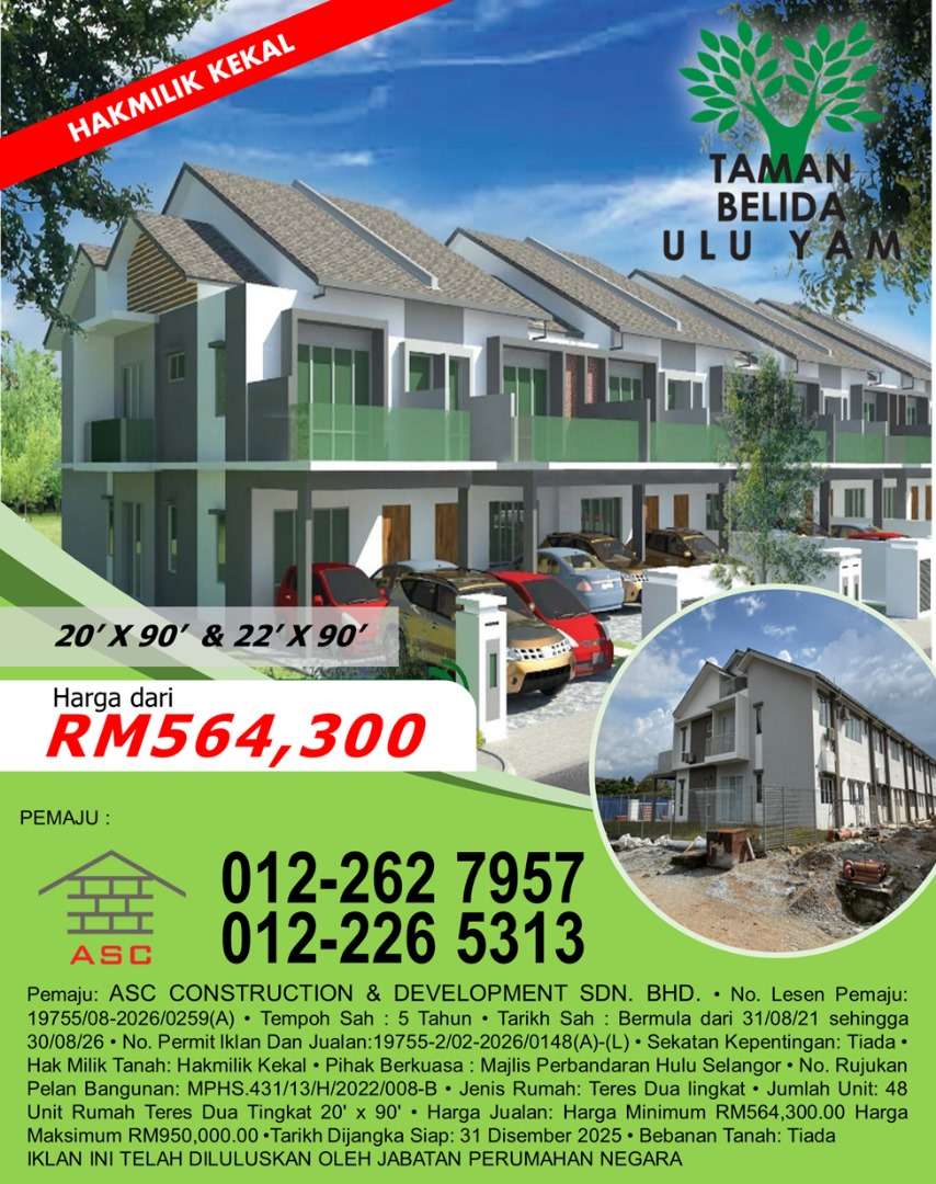 Pemaju: ASC CONSTRUCTION & DEVELOPMENT SDN. BHD. • No. Lesen Pemaju: 19755/08-2026/0259(A) • Tempoh Sah : 5 Tahun • Tarikh Sah : Bermula dari 31/08/21 sehingga 30/08/26 • No. Permit lklan Dan Jualan:19755-2/02-2026/0148(A)-(L) • Sekatan Kepentingan: Tiada • Hak Milik Tanah: Hakmilik Kekal • Pihak Berkuasa : Majlis Perbandaran Hulu Selangor • No. Rujukan Pelan Bangunan: MPHS.431/13/H/2022/008-B • Jenis Rumah: Teres Dua lingkat • Jumlah Unit: 48 Unit Rumah Teres Dua Tingkat 20' x 90' • Harga Jualan: Harga Minimum RM564,300.00 Harga Maksimum RM950,000.00 •Tarikh Dijangka Siap: 31 Disember 2025 • Bebanan Tanah: Tiada